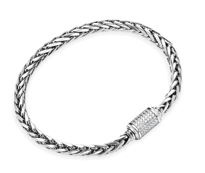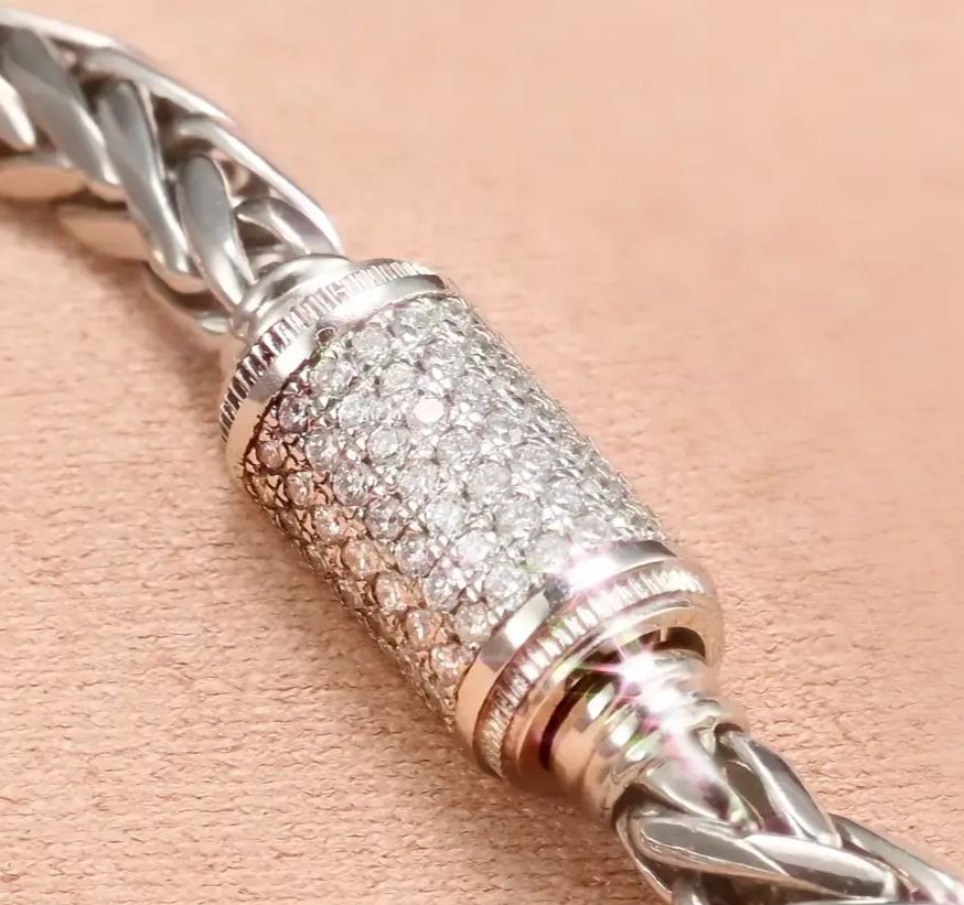 방향에 관계없이 동일한 모습을 보여주는 패턴으로 활동적인 분들에게 자유롭고 편한 착용감을 드립니다. 4.7mm의 세련된 디자인과 묵직한 중량감은 비교할 수 없는 중후함과 독특한 감각의 조화를 드러냅니다. 개성이 강한 내추럴한 디자인이 다이아몬드의 신비로운 광채와 어우러져 고급스러운 재질감과 특별한 품격을 드러냅니다. 다이아 몬드로 세팅되어 여자분께 선물 하기 좋은 여자 다이아몬드 백금 팔찌 입니다